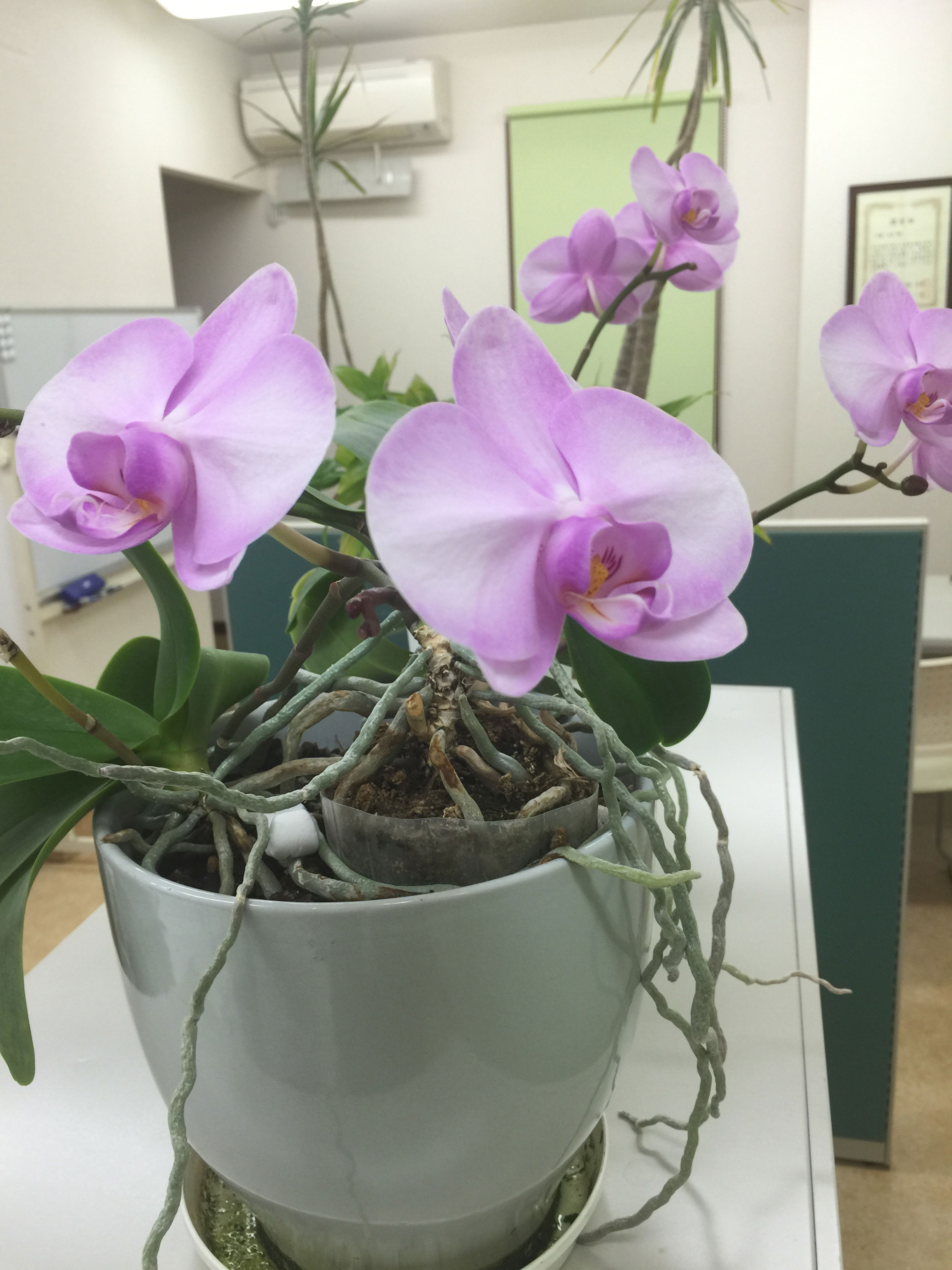 この胡蝶蘭、開業した5年前にいただいたものですが、今年も咲いてくれました。他にいただいた胡蝶蘭は全て1年以内に枯れましたが、この花だけ毎年咲いてます。
